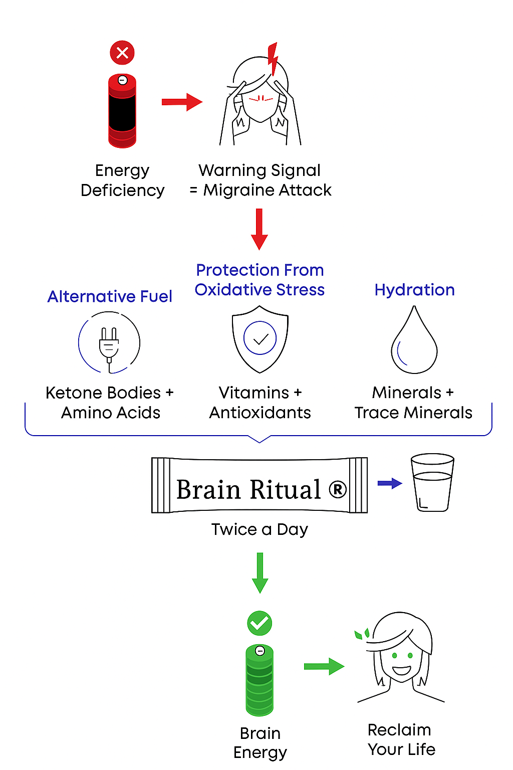 Brain Ritual® has been specifically formulated with high-quality nutrients to meet the nutritional requirements of migraine sufferers by compensating for dysfunctional brain energy metabolism. This includes D-beta-hydroxybutyrate, a bioactive and bioidentical alternative, a more efficient energy source for the brain, as well as bioavailable versions of most vitamins, antioxidants, trace minerals, amino acids, and more. It is designed to be a one-stop energy metabolism shop.