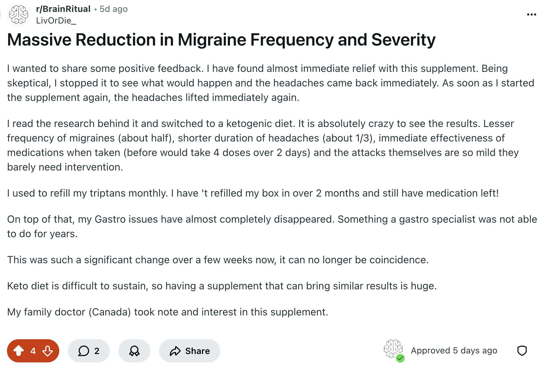 My teenage daughter has had migraines since middle school. Nothing helped, even prescription meds. We both tried Brain Ritual together (I get them too) and we’ve both seen fewer attacks and way milder symptoms. Feels like a blessing tbh 💕