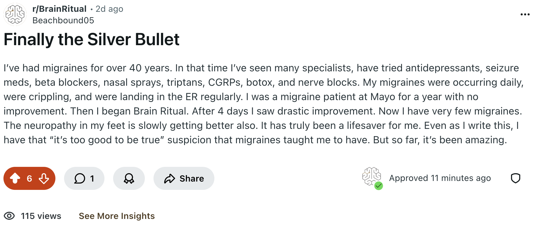 Before Brain Ritual I canceled trips, missed work, lost hope. After six months I’ve reclaimed so much time and joy. Thank you to the team who created this.